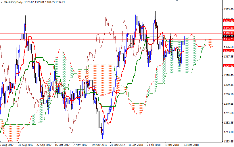 Gold prices fell $3.13 an ounce on Thursday as investors took profits from a rally spurred by a less hawkish than expected Federal Reserve and concerns over a brewing trade war with China. XAU/USD traded as low as $1324.66 but the anticipated support at the top of the 4-hourly Ichimoku cloud kicked in and pushed prices higher. The market rose further during today’s Asian session and reached a technical resistance at around $1340.
